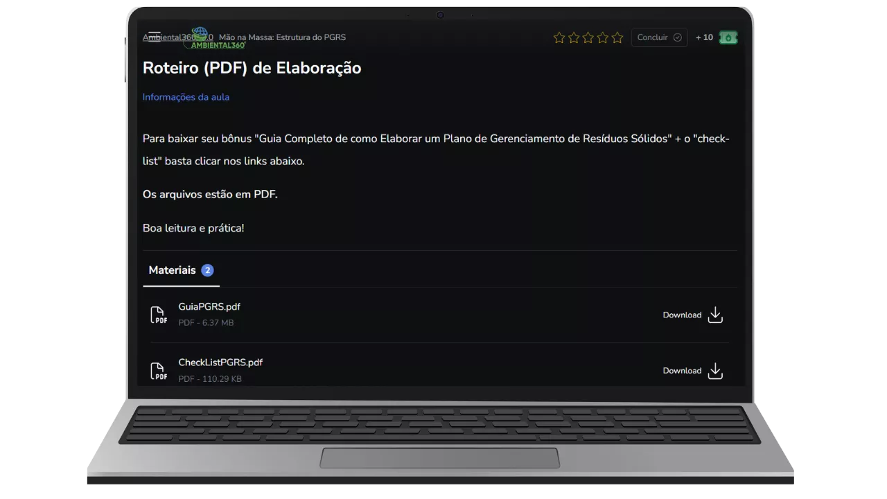 Nesse bônus, eu te mostro a estrutura de um Plano de Gerenciamento de Resíduos Sólidos para você aplicar no seu cliente. Tudo pronto, passo a passo, inclusive com um checklist de campo, pra aplicar e ter a confiança que está fazendo do jeito certo.